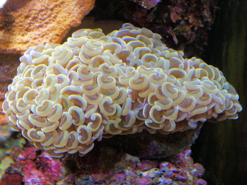 Jeg har sjovt nok lige oplevet det diametralt modsatte af stakkels Tanne i det indslag Mark linker til. Jeg købte for små 2 uger siden en orange Euphyllia i den lokale saltpusher-butik. Eller det vil sige fruen overtalte mig til at købe den. Jeg syntes nemlig selv den så temmelig farveløs ud. Den kostede dog heller ikke ret meget, og en gang imellem skal de jo føle de bestemmer lidt, så jeg lod mig overtale. Heldigvis da, for efter kun 4-5 dage hjemme hos os var den til min overraskelse blevet ganske smuk. Den så på det tidspunkt sådan her ud (msåke endda en smule mere orange i virkeligheden):