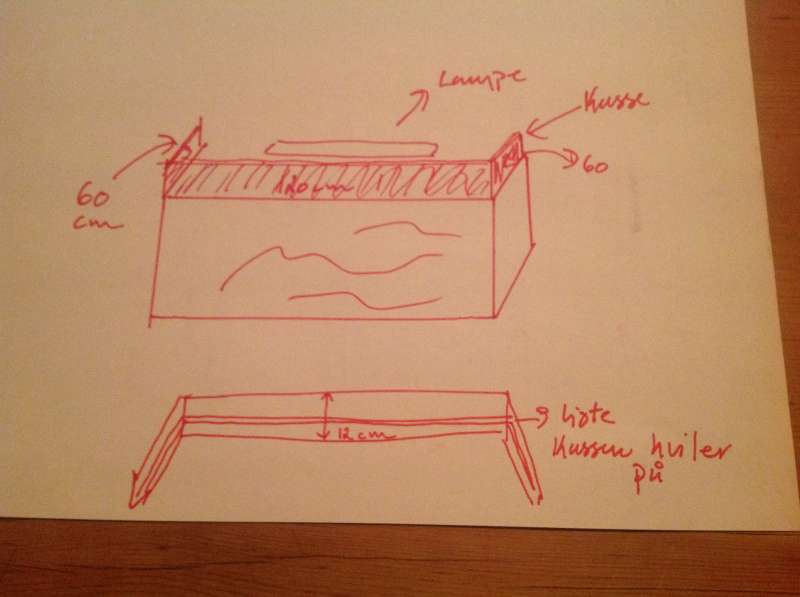 Jeg får i næste uge mit nye akvarie på 288 liter. Det er lavet specielt og derfor uden nogen form for kasse rundt om formoven(lampekasse). Der kommer en Maxspect razor henover. Nu tænker jeg at jeg vil fabrikere en form for kasse uden låg rundt om LED lampen, den skal være åben bagtil og egentlig bare afskærme og afslutte akvariet. Den skal være lige til at løfte af.