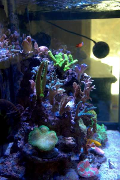 Jeg har også leget lidt med lyset, har fået skiftet lenserne på max'en til 120gr hvilke jo er en klar forbedring med spredningen og farve samblandningen af farverne, men havde længe gået og kigget på mit varmelegme på 150wat som lyste hvergang jeg kiggede, så efter jeg fandt en brugt Arcadia t5 controller med 2x24/39watt til en rigtigt god pris, slog jeg til og har så købt et Aqualine Reef White 15k rør og et Actinic rør begge på 24 watt.