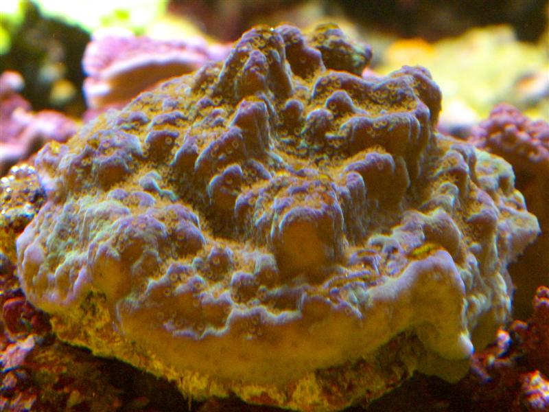 Sjov acanthastrea denne her. Lilla og gul i midten og næsten igen aftegning af de enkelte polypper: