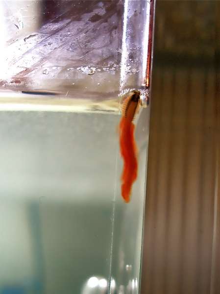 Vinduet havde stået åbent en aften, og lyset havde lokket stankelben indenfor. Men hvordan det er havnet i akvariet er mig en gåde. Der er dækglas på akvariet med to små afskårne hjørner til ledninger som eneste åbninger. Her må dyret være dumpet igennem...