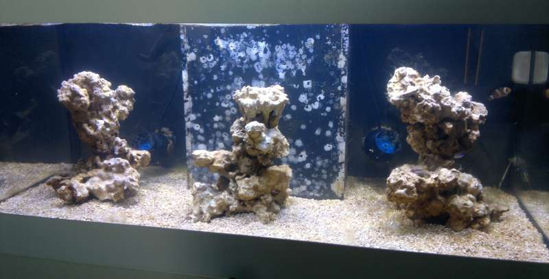 Jeg købte 3 stk. Atoll nanosøjler og helt nyt grus fra Deepocean.dk. Så d. 09-01-2014 tømte jeg akvariet, og det blev gjort fuldstændig rent, og de par fisk og koraller som jeg havde kom op i en spand med varmelegeme og cirkulation, til vandet var klaret op. Alle de gamle levende sten blev smidt ud, da de som sagt var fyldt med boblealger, og vil ikke sælge problemet videre til andre. Da jeg kun have de tre Atoll-søjler og ingen levende sten, så valgte jeg at starte op på hanevand.