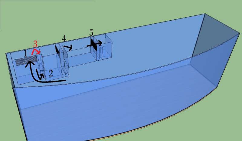 5 - Et sidste kammer til returpumpe, men også en midterskilning, så 50% af vandet bliver returneret via returpumpe og 50% af vandet skal køre igennem en spandpumpe, kendt fra ferskavandsakvarier for yderligere filtrering. Endnu en rist, så kammer 4, også kan benyttes til fisk og andet liv, hvis det skal i karantæne eller i sikkerhed indtil evt. salg, tilbagelevering eller andre opstået situationer.