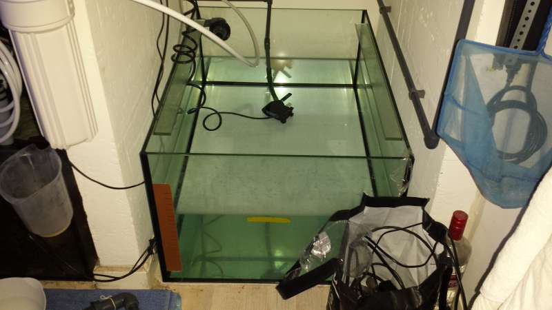 første tank indeholder 160 L osmosevand til efterfyldning. Anden tank også en 160 Liters men dette er vores primære sump hvor der bliver sendt vand til skummer og gennem filter og alt kommer retur og tilbage til akvariet. skal dog på sigt laves lidt mere om, da den del kan gøres beder og mere optimalt. sidste tank er også et 160 liters akvarie som pt. bliver brugt til fiske pasning, men som på sigt skal blive en del af sumpen og rense systemet. skummer lidt for stor til at stå under systemet 220cm høj og 40cm i diameter fødes med ca.2000 liter vand i timen og med ca. 8000 liter luft. Grotech HCR 200 kalkreaktor med 6kg flaske. sådan kan en sump også se ud når der ikke er plads under ens system, og det har fordel og ulemper, men muligheden for hele tiden at bygge vider på det, som der kommer nye ideer.
