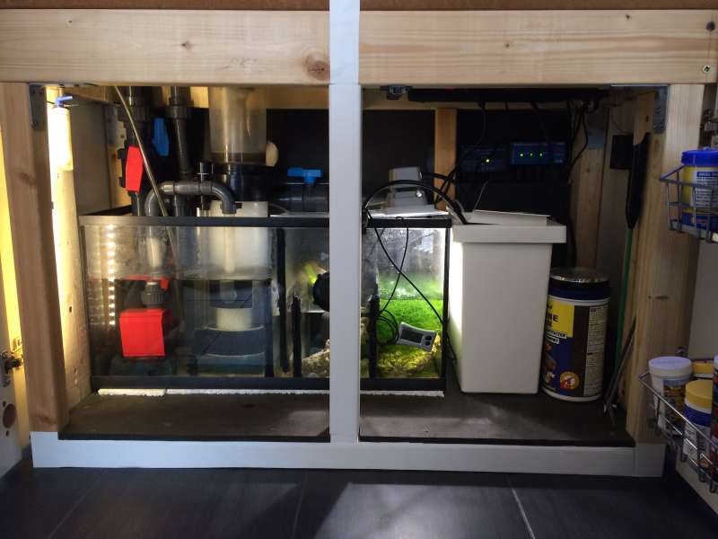 Her er et af min -som passer mit 300 liters sps og lps display- med en Korallin 1501 kalkreaktor, 36 w UV filter, Skimz sm121 skummer, Tunzemulticontroller til cirkulationen, Tunze level control, Et par tænd sluk ure til at styre HQI lys og blæsere og endelig en Tunze silence 2400 liter til returen.