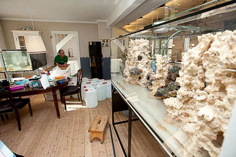 Det hele kom langt om længe i hus og dagen oprandt. Det blev lidt af en udfordring, da det nye akvarie skulle stå på noget af pladsen hvor det gamle stod. Med hjælp fra giga kar og dunke fra Carsten gik jeg en meget tidlig søndag morgen igang med at tømme.