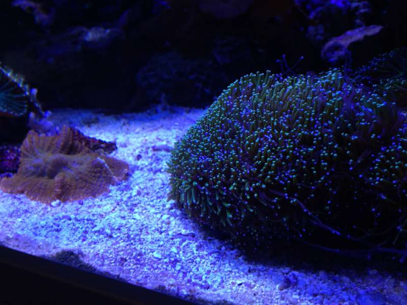 Akvariet er 100 cm bredt, 80 cm dybt og 70 cm højt = 560 L. Som sump har jeg nedenunder et gammelt dyrehandler-akvarie fra Planteimporten på 80x50x35 = 140 l. Sumpen er indrettet med skummerrum, refugie, returrum og ferskvandskammer. Det meste af vandet løber til skummeren, en smule i refugiet og det hele bliver sendt retur af en Red Dragon 6500.
