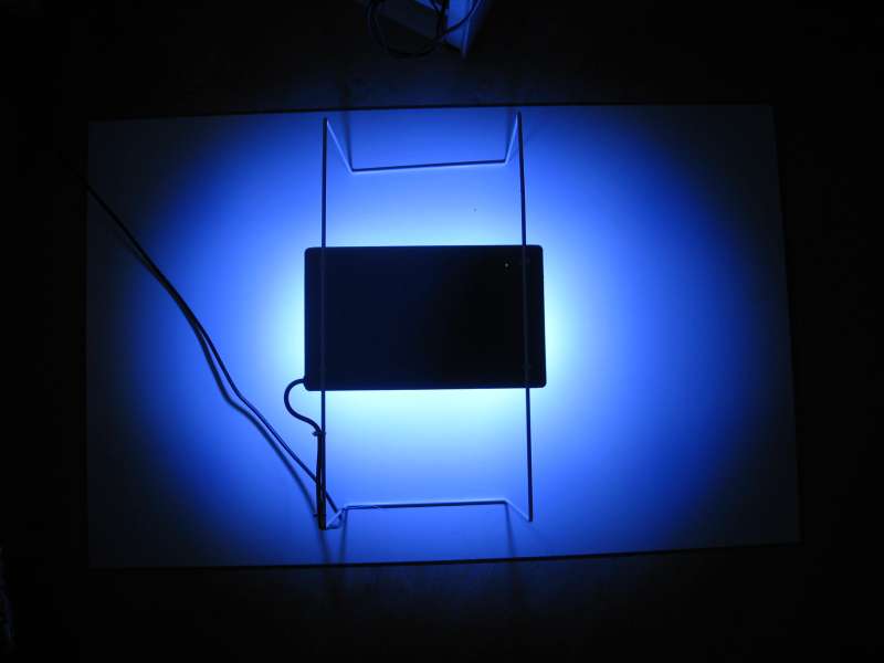 Vores hobby kan være temmelig omkostnings krævende (ifølge konen), derfor et konstant spørgsmål, hvordan får jeg mere vand i stuen uden mere elforbrug ? Jeg skar et stykke pvc ud på målene 110x70cm, højden bliver 45cm, og placerede min lampe, en Radion 1 generation med 80grader linser oven på pladen. Højden fra plade til lys er 23cm og det er ikke nok til at dække tanken, men hvis jeg opgraderede lampen til 3 generation med 120grader linsen vil den nok kunne dække hele tanken, og så er det måske muligt at sælge ideen.