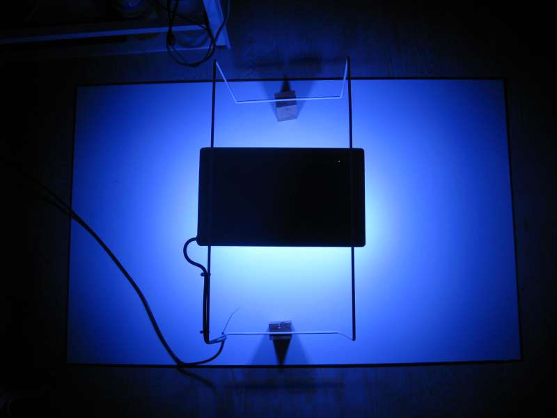 Vores hobby kan være temmelig omkostnings krævende (ifølge konen), derfor et konstant spørgsmål, hvordan får jeg mere vand i stuen uden mere elforbrug ? Jeg skar et stykke pvc ud på målene 110x70cm, højden bliver 45cm, og placerede min lampe, en Radion 1 generation med 80grader linser oven på pladen. Højden fra plade til lys er 23cm og det er ikke nok til at dække tanken, men hvis jeg opgraderede lampen til 3 generation med 120grader linsen vil den nok kunne dække hele tanken, og så er det måske muligt at sælge ideen.