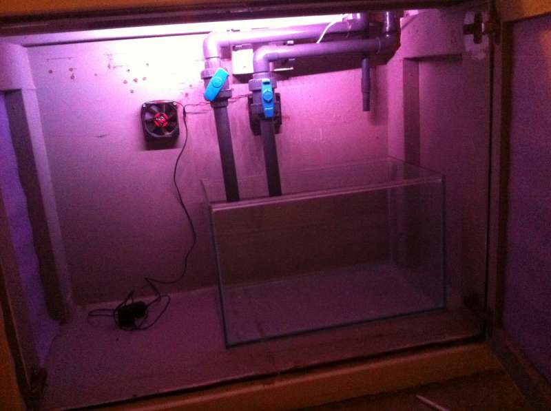 Sumpen bliver ikke særlig stor da jeg ikke vil have et proppet skab. Ligeledes skal der være styr på ledninger osv, hvilket betyder at der bliver sat kabelskjulere op. Ovenstående billede billede viser sumpen samt det canvas, der kommer til at udgøre ATS'en. Der kommet et lille returkammer i sumpen og ellers intet andet. Måske en en filtersok ved ATS'ens udløb, så jeg kan få frasorteret det værste svæv fra vandet. Sådan kører mit nuværende system og det er jeg egentlig glad for. Jeg ved godt at dette kan betyde noget for produktionen af pod's, men jeg har ikke lige fundet en god løsning endnu. Skulle nogen have et godt bud må I meget gerne skrive her i tråden.