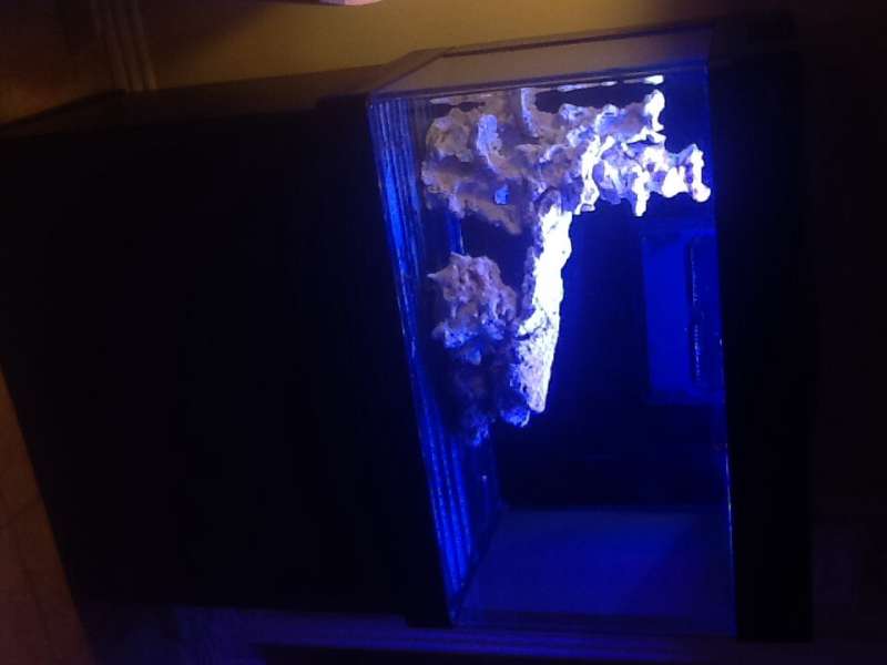 Sammen med ca 10 kg sten. Derud over er der indkøbt ca 10 kg levende sten så et sted imellem 25 og 30 kg. Sten og 20 kg levende sand. Stensætningen er lavet med henblik på at skulle dækkes af sps.