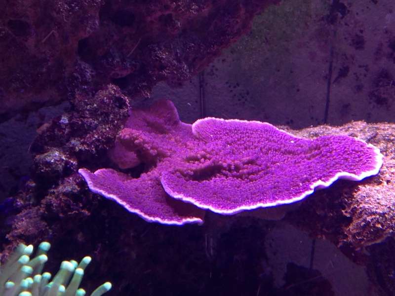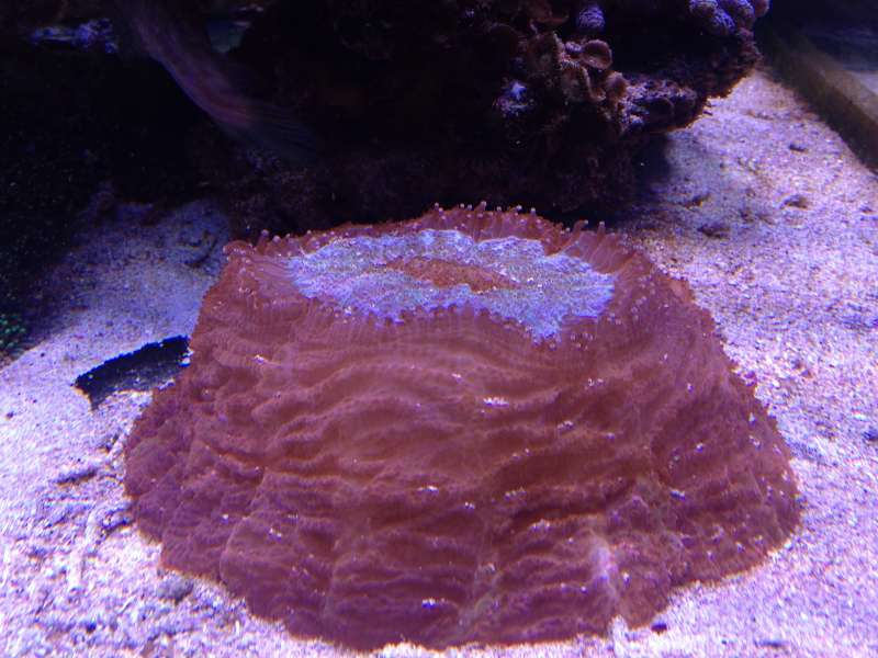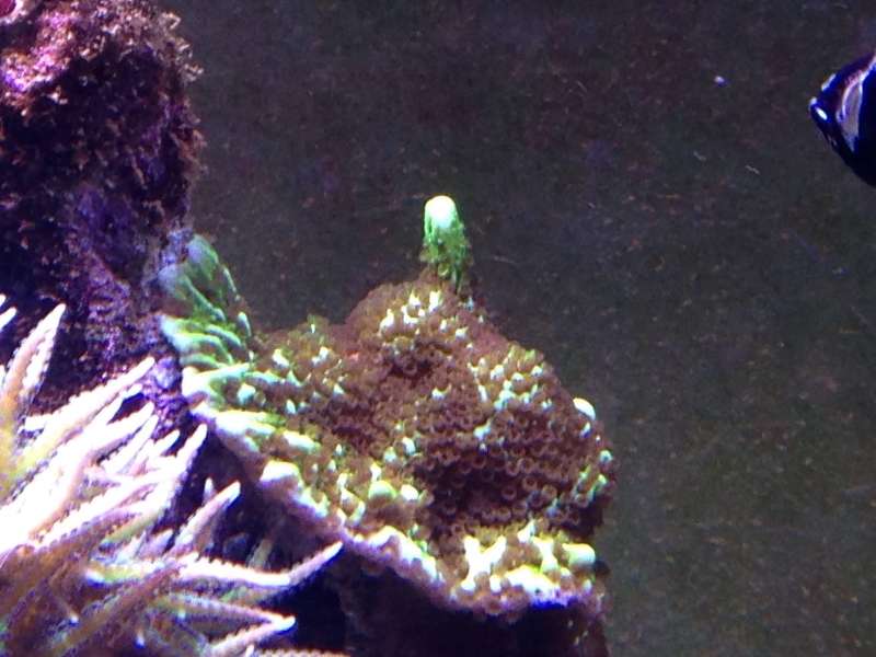 Min Sunset er efterhånden også faldet godt til, den har sat en flot dyb grøn farve og er begyndt at vokse udover stene. "Desværre" har den en kraftig og tæt polyp-udfoldelse så jeg ser ikke rigtig den flotte orange bund
