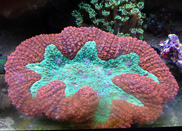 Jeg har 2 af disse i mit akvarium. Den ene er ca 1/2 cm og den anden (billedet) er vokset til 3-4 cm i diameter. Den er fjerlet og ligger på sandbunden. I aftenlys (blå lys er den fluoraserende rød og fluoraserende grøn i midten.