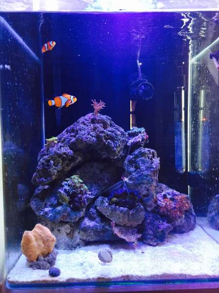 Det nyeste billede af mit lille nano reef. Der er blevet rykket lidt rundt og kommet flere ting i baljen. Det overlevede at blive passet i ferien, men det var på et hængende hår. Synes det er blevet flot. Men som i ved er man jo aldrig helt tilfreds!