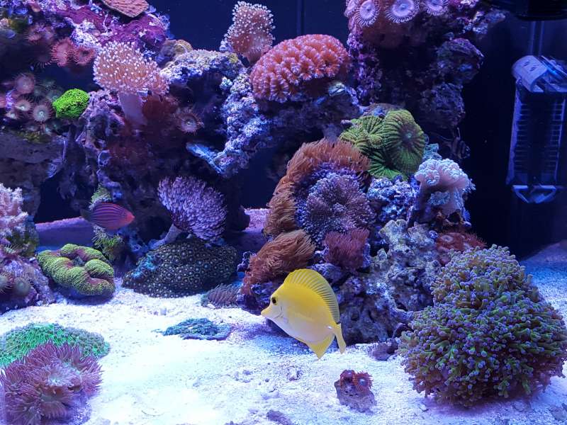Akvariet er et 450liters Bima made med weisglas i alle 4 side 130*70*50cm med trekantet overløb i højre hjørne og bølgebrydere.
