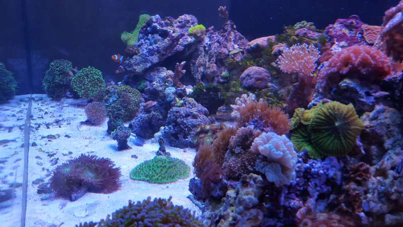 Akvariet er et 450liters Bima made med weisglas i alle 4 side 130*70*50cm med trekantet overløb i højre hjørne og bølgebrydere.
