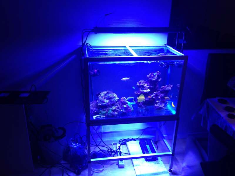 Mine fisk er indtil videre flyttet over i et 200 liters, Midlertidigt. Der er kun lidt sten, varme, cirkulation og lys. Ingen skummer!! Så er spændt på hvordan det går..