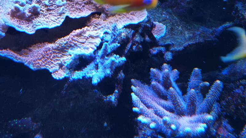 Montipora "Jedi Mind Trick". Billedet er taget med mobil en tidlig formiddag, for at undgå blåfarvning. Håber det går alligevel.