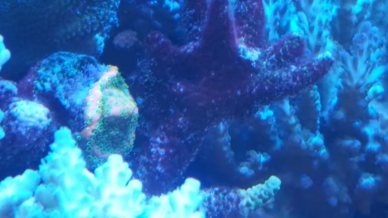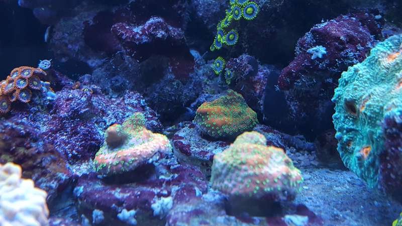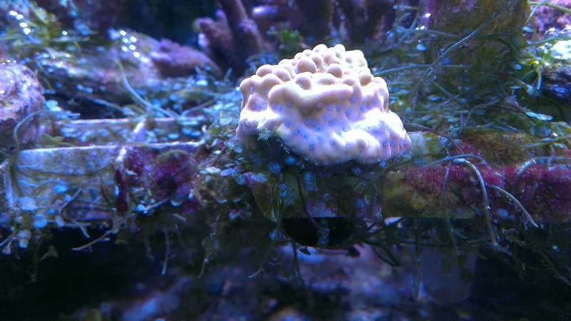 Det er et mobil billede, taget sidst på eftermiddagen hvor det blå lys er begyndt at tage over. Den er nu begyndt at blive smukt orange i bunden og har fin PE. Man kan også se de forholdsvis store polypper.<br />Jeg håber at den vil encruste ud over de omgivende koralskeletter og danne en egentlig koloni, som den der er vist i videoen nederst.