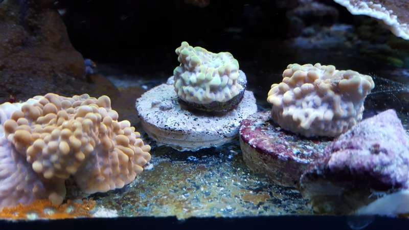 Jeg havde 10 stk som pga plads problemer blev sat i plejeakvariet. De blev alle brune i bunden og ret lyse i det, mens polypperne foldede sig ud som normalt, måske i lidt mindre antal. Så snart de blev flyttet til display, fik de den orange farve igen efter et stykke tid. Dem der er på billederne, har alle stået med brun bund.