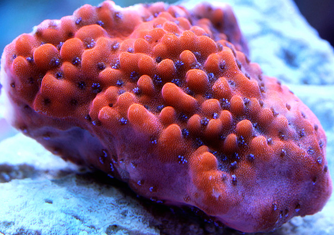 Fin koral med en særpræget farve. Den er helt gylden, kan have grønne områder iblandet og har helt blå polypper. Den har en knoldet overflade, hvor de blå polypper gemmer sig nede i mellem knoldene. Det er en smuk koral. Anderledes med den gyldne farve.