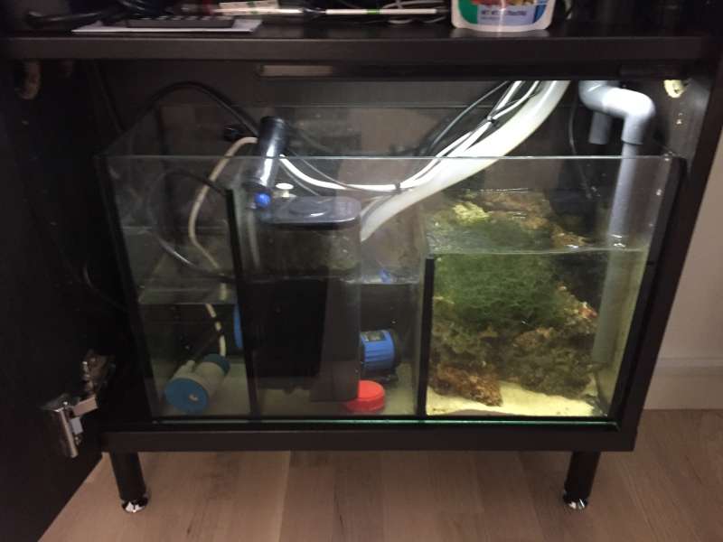 Jones skrev:Det ser godt ud. Men det minder også om mit lille 54 liters systemJeg vil anbefale dig at flytte skummeren til det andet kammer, hvor vandet kommer ned fra akvariet, da du så mindsker mikroboblerne fra den.