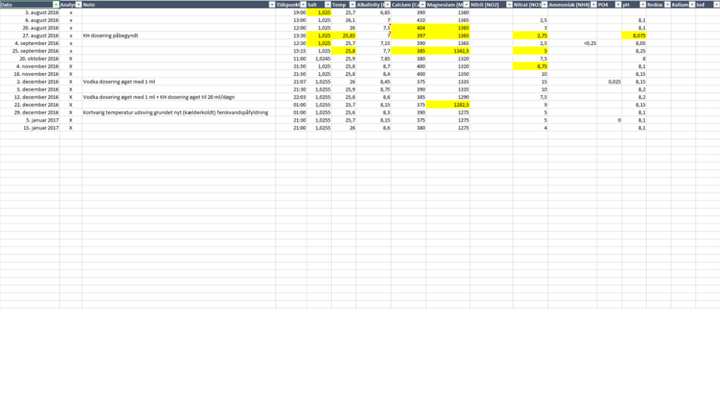 Jeg tænkte at jeg lige ville dele dette lille excel-ark som jeg bruger til opsamling af mine tests (KH, Ca, Mg, Temp, Salinitet osv.). Det koster selvfølgelig gratis - men jeg synes at det givet et godt overblik over udviklingen på værdierne. Der er ingen manual lige pt. - men jeg svarer selvfølgelig gerne på spørgsmål hvis nogen skulle have dette