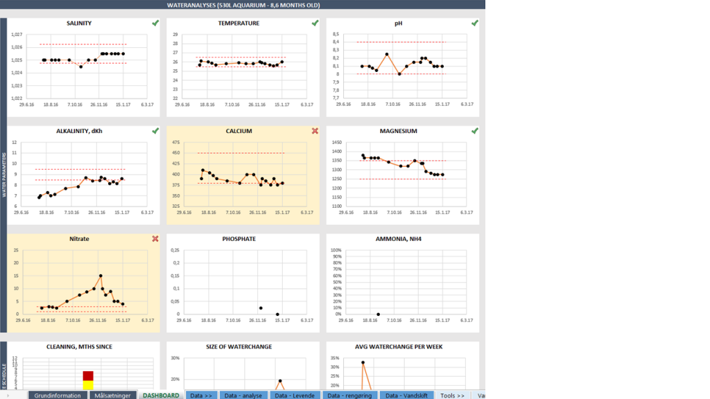 Jeg tænkte at jeg lige ville dele dette lille excel-ark som jeg bruger til opsamling af mine tests (KH, Ca, Mg, Temp, Salinitet osv.). Det koster selvfølgelig gratis - men jeg synes at det givet et godt overblik over udviklingen på værdierne. Der er ingen manual lige pt. - men jeg svarer selvfølgelig gerne på spørgsmål hvis nogen skulle have dette