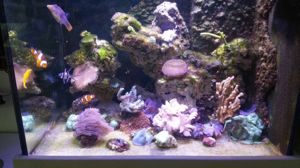 Her er et billede fra d. 6/2 Den ser sådan ud i dag. Derudover er der kommet lidt Montipora i og lidt LPS i form af noget Chalice og en Lobophyllia Fiskebestanden er stadig sparsom og består af et par Occelaris klovne, en gyl gylte, en Fridmani, en Bangai kardinal og en Picassofisk. Næste skridt må være at øge fiskebestanden lidt.