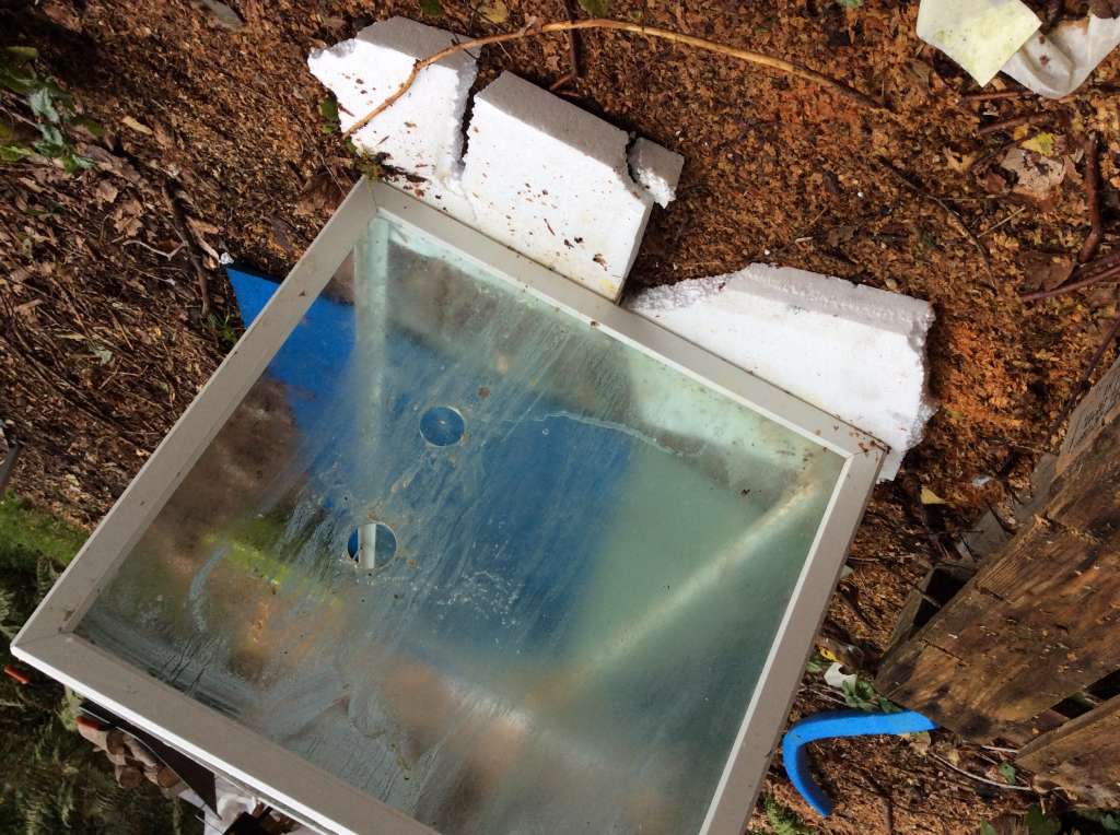 kommer man til sætte hullet for langt nede, er det jo bare at montere en stump rør i vinklen, så man får den ønskede højde. For at fisk og andet levende ikke skulle smutte ned og sætte sig på tværs. Rullede jeg et stykke tagrendenet sammen og satte det ned i vinklen.Jeg har desværre ingen billeder af det