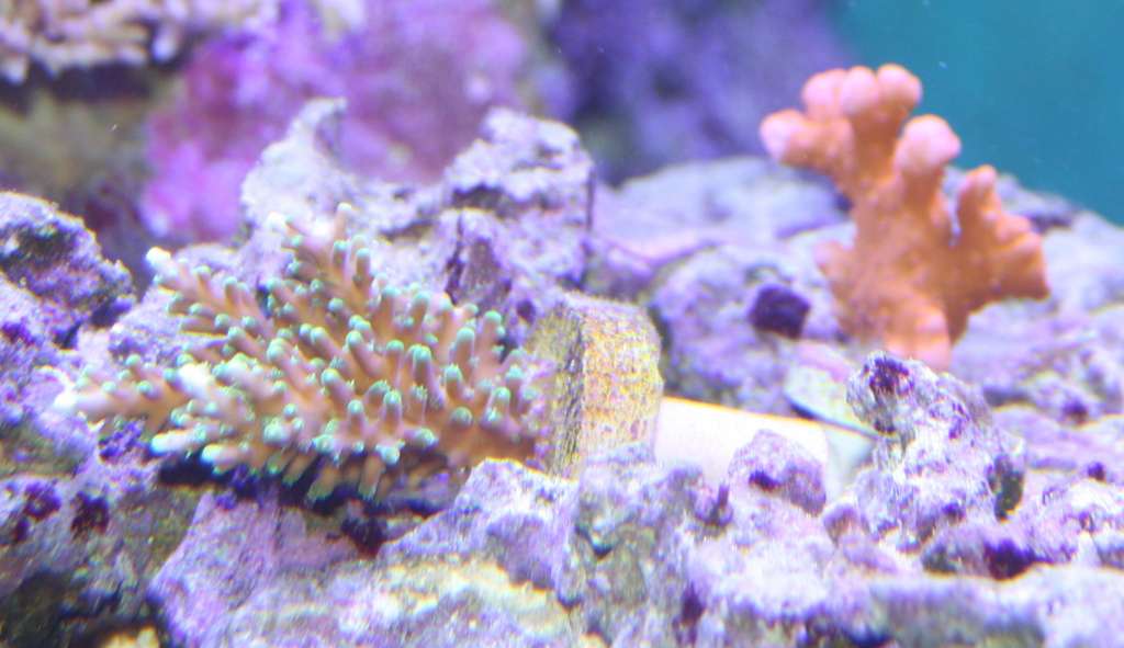 Så jeg har ikke haft fingrene i baljen i lang tid efterhånden, ja ud over at lime lidt koraller på plads, jeg er meget tilfreds med måden jeg hængte min grønne acro fra Australien. Den fik plads på mit "bedste" sted, eller der hvor jeg regner med at montere de mest eksotiske koraller. Derfor min min SSC lov til at blive i et stykke, så den med tiden kan komme at dominere lidt, og dominere kommer den at gøre, det ses desværre ikke på billederne (heller ikke på de nærbilleder jeg tog) men den er ved at komme sig rigtig fint. Den pastelgrønne grundfarve kommer tydeligt frem på den nye skud og topperne får fine røde farver, måske mere hen mod rosa, men jag håber den røde farve bliver mere tydelig.
