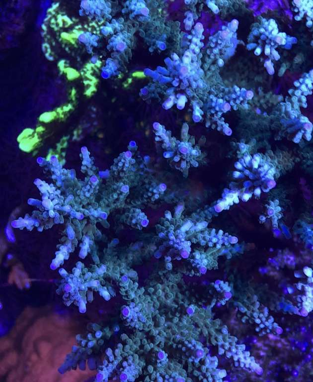 Den flotteste af mine 2 ssc kolonier er i midter zonen i akvariet , der kan den holde sin mint grønne bund farve ordentligt , ved høj belysning bliver min mere støvgrøn , men ved der også er enormt meget forskel på farverne på dem , alt efter hvor de er kommet fra , mine er de Australske varianter , men der er jo også andre faktore der spiller ind på farverne såsom din po4, no3 , sporstoffer , generel fiske afføring osv. :wink: