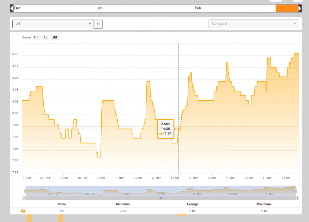 Om PH kurven bare er vokset pga SKIM vil jeg ikke med 100% sikkerhed sige, da jeg har boostet KH fra 7,1 til 8,2 (lidt høj) og salt fra 33,4 til 34ppm, det kan også skyldes at mine macro alger er begyndt at vokse meget igen, eller nærring nu er nede grundet algerne, ja eller noget helt andet, men det er meget længe siden jeg havde så høj PH.