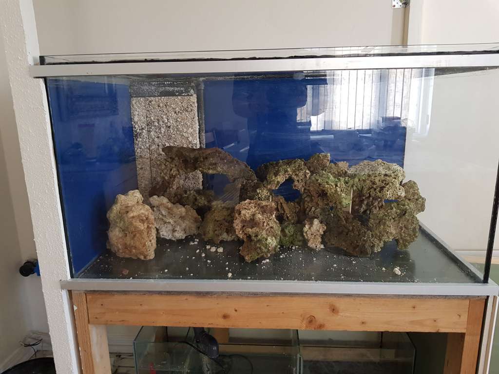 der bliver jo også tilsat lidt løbende iform af de koraller med køber bytter får af andre er der eller var der jo tit en sten under :) så ja var måske knap 90 kg men vil så også nævne at kun overløbet er bygget af tøre ls resten er gamle indkørte sten fra mindre akvarie + nogen jeg havde fået af en anden salt akvarist.....
