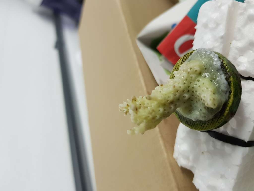 Jeg fik mine pakker og kørte hjem. Begyndte at pakke ud og alt så fint ud - i den første kasse. I den anden kasse, var to ud af 4 poser mælkede og der lå tydeligt væv på bunden. Korallerne var døde. Temperaturen var ok, 21,5 grader, hvilket ikke er et problem.