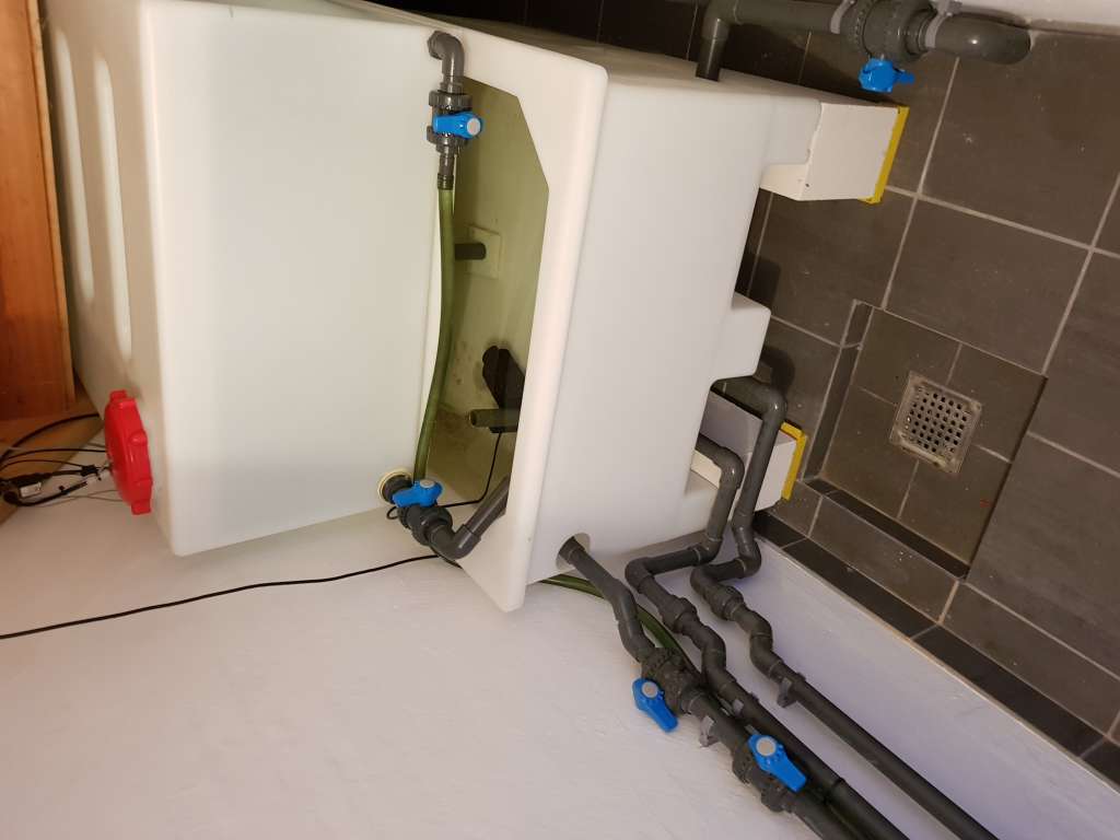 Vandskifte og Ro tanken. Der står altid 180L Ro vand klar. Hanen til højre er til flydning af Top off dunken.