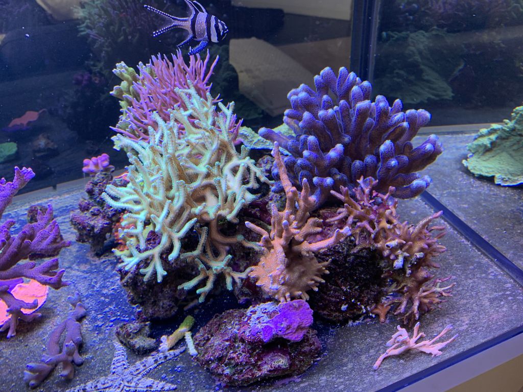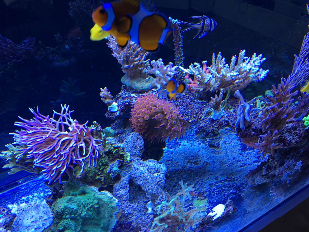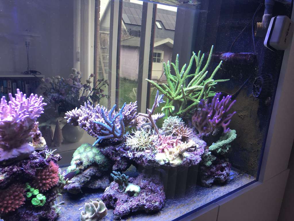 Nu er det 2 måneder siden at alt blev flyttet og er forsat meget meget tilfreds men rumdeleren. Jeg ved godt det ikke er det største kar i verden, men jeg bilder mig ind at jeg kan se beboerne trives med den ekstra svøm længde. Overordnet set er jeg tilfreds. Farverne er komme tilbage på næste alle koraller, og jeg kan se vækstspidser samt PE, jeg har 2 koraller der driller. Den ene er en bridsnest jeg har den 4 steder, 2 i akvariet og 2 fragmenter i det lille fragtank under akvariet. De 2 i fragtanken trives og har fuld PE dem i akvariet trives overhoved ikke. Ingen PE. Tænker det må være en lys ting. Jeg har tilføjet 2 lightbars fra Kinaland…. Måske er de forstærke. Det der undres er bare at det kun er den ene der er lige under, den anden tænker jeg slet ikke bliver ramt af det lys. Hmmm…