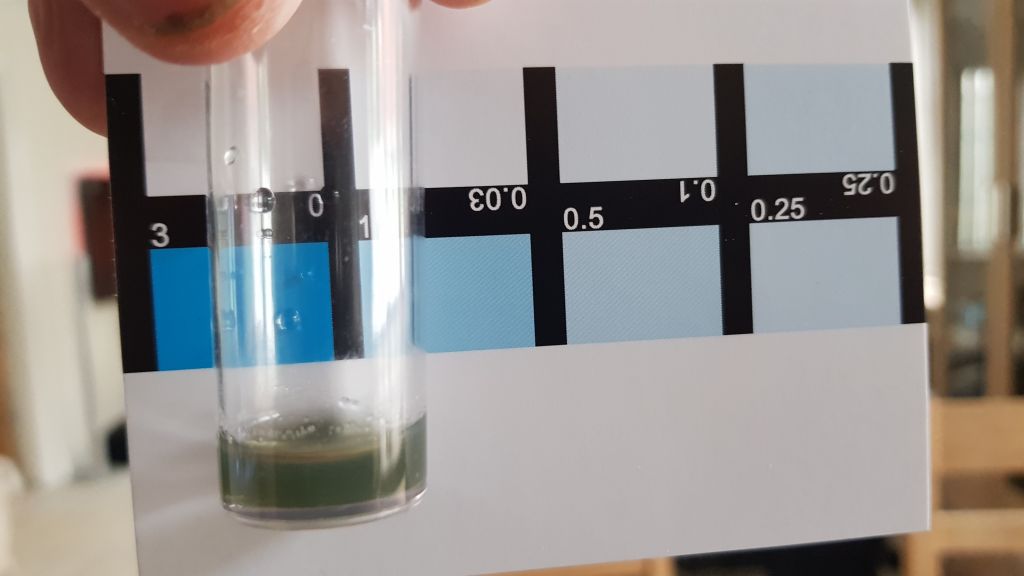 Blot til forklaring hvorfor jeg overhovedet begyndte at kigge efter det: Det virkede ulogisk for mig, hvis man skulle kigge fra siden på et rundt prøveglas. Hvis det var meningen man skulle kigge fra siden, ville jeg mene cuvetten burde være firkantet (som vi kender det fra nitrat test) og der burde være præcis 10 gange mere væske fra siden end fra toppen. På glasset på billedet ser der kun ud til at være 1,5 -2 gange mere væske fra siden end fra toppen