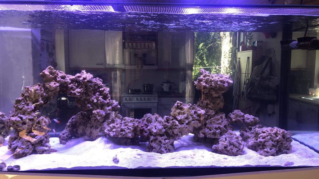Det ligner næsten coraline, men det er udelukkende cyano der dækker stenene, så det er rimelig slemt.. sjovt nok er sandbunden næsten urørt.. startede op med Marco døde sten og red Sea Reef mature... kunne sikkert have noget med det at gøre