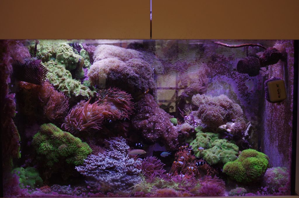 Jeg er blevet træt af stensætningen i mit akvarie, og vil gerne omrokere lidt men ved ikke, hvordan jeg skal gribe det an. Det drejer sig om stendyngen i højre side og den sten der danner en bro fra højre mod venstre ( i midten af akvariet med alle de rosafarvet skiveanemoner på ) som jeg gerne vil omrokere. Da stenene er vokset til i skiveanemoner og andet skidt kunne jeg godt tænke mig at bruge sten fra sumpen istedet for, så jeg har mulighed for at sætte lidt nye og andre koraller fast. Jeg vil gerne flytte stenene længere bagud, men kan se at der ligger tonsvis af skidt og beskidt sand under stenene, der har samlet sig gennem årenes løb. Jeg har prøvet om det kan suges op, men kan simpelthen ikke komme til med en slange, dels fordi korallerne på bunden står i vejen men også fordi mine arme ikke er lange nok til at nå.