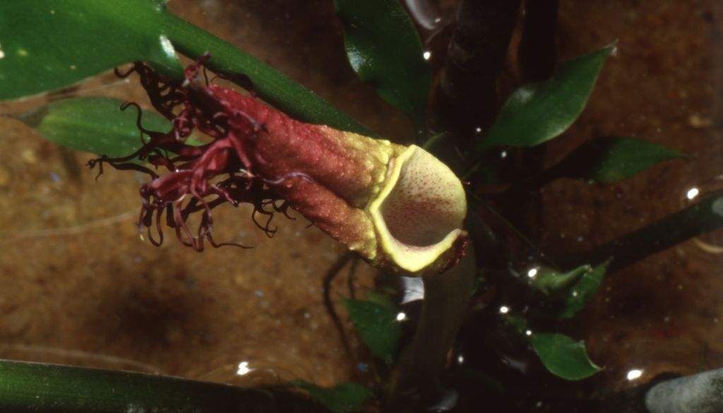Akvariet var indrettet som et paludarium med kun 20 cm. vandstand. Jeg eksperimenterede med salttålende vandplanter - bl.a. Cryptocoryne ciliata, som sendte blomster op over vandoverfladen.