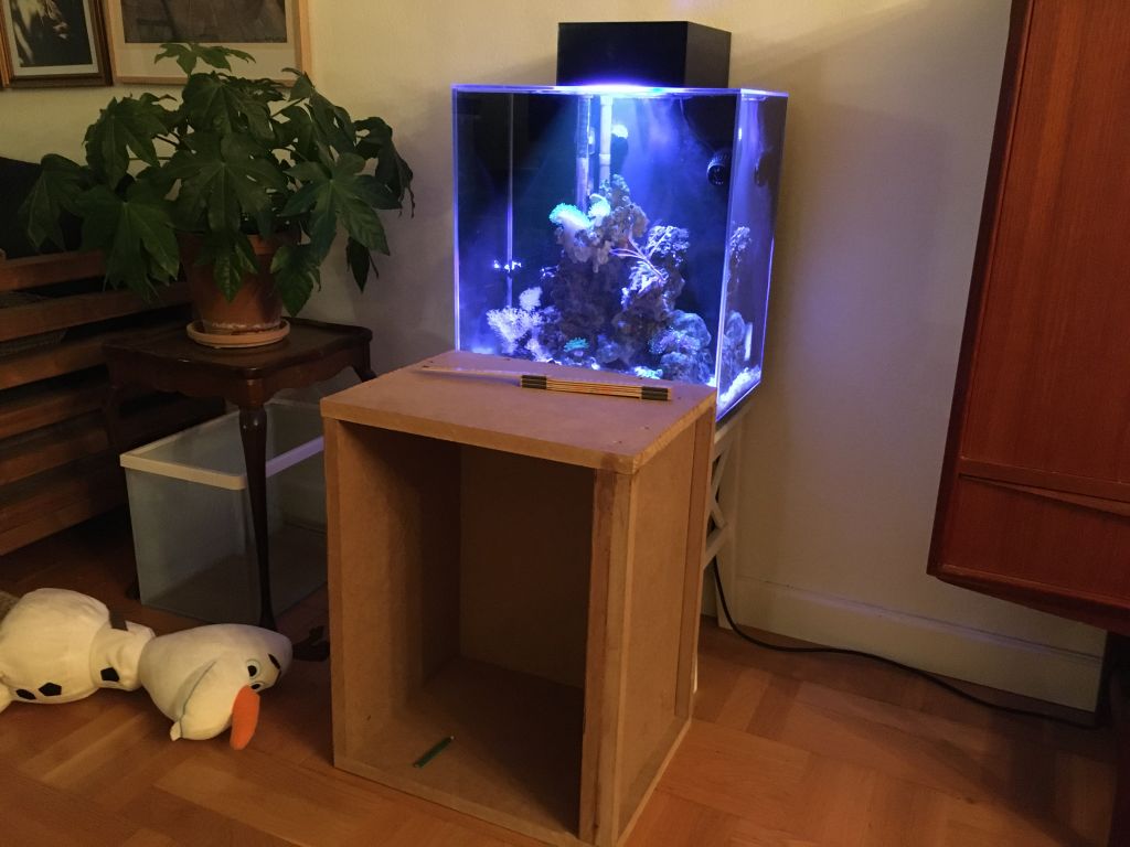 Jeg kan godt lide at bygge ting selv og havde nogle mdf pladerester stående. Det og så det faktum at jeg gerne vil have en sump under mit Fluval edge 46 fik mig til at bygge et skab. På siden skal der være apex controller, iPad med apex fusion, vortech og retur controller. Måske også controller til skummer, hvis jeg køber en med dc pumpe. Skabet er lavet på mål efter Fluval akvariet, malet med vådrumsmaling indvendigt og en vandafvisende maling på ydersiden. Alle materialer er genbruge. Eller noget jeg havde i forvejen.