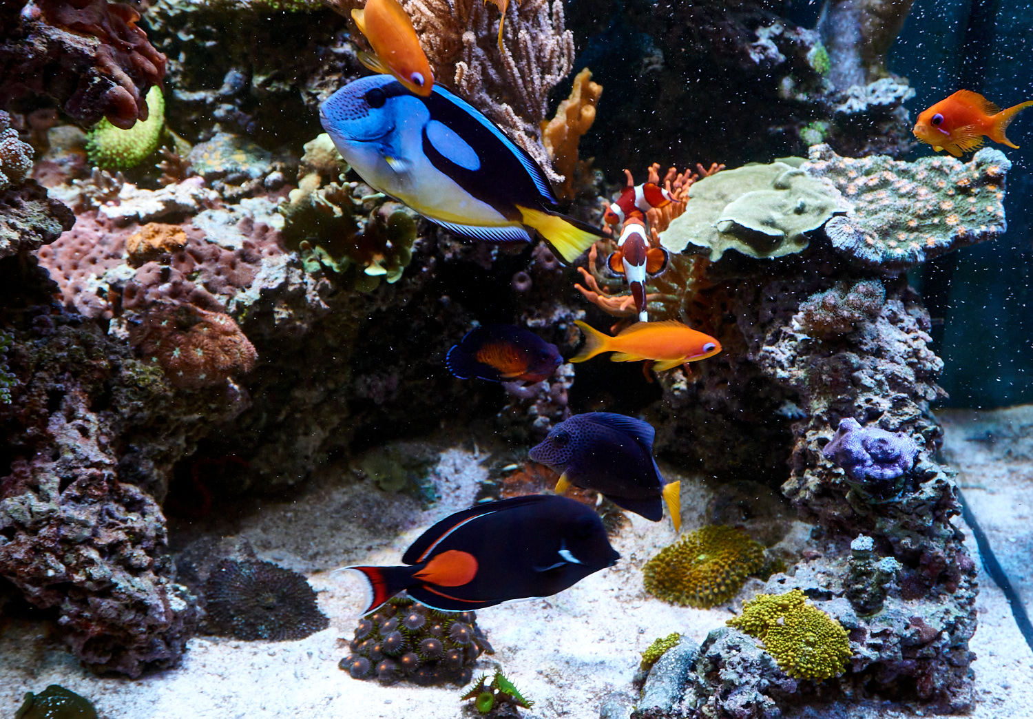 Tror det det så småt er ved at komme på fode igen, omend det stadig ikke er alt der trives lige godt. Fiskene har det godt. Kirurgerne er snart 9 år (Achilles 8½) Dog forsvandt min koralvogter for at halvt års tid siden. Til min overraskelse havde både min mandarin og mine rejer åbenbart været intimideret af den. Tidligere så jeg dem stort set aldrig, nu er de fremme hele tiden. Den ene reje er omtrent snart på størrelse med en caribisk languster. Det er lige før den skubber kirurgerne til side når der fodres. Jeg kan da lige poste et par friske billeder, omend det bliver med snavsede ruder.