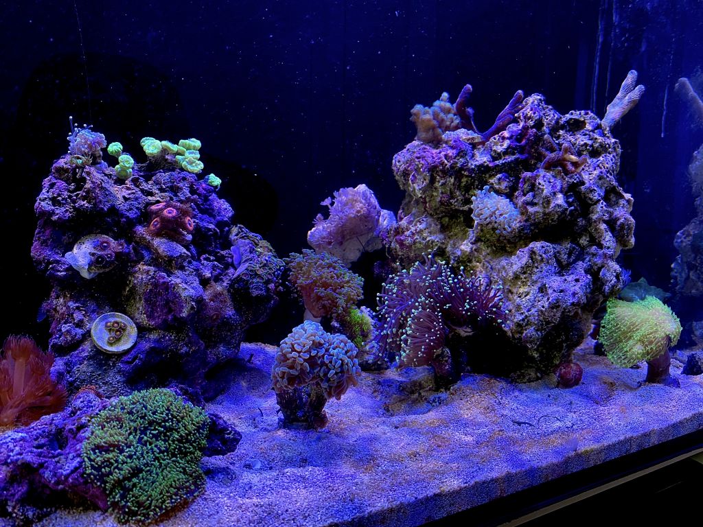 Den begyndte at blive større, og vikser ret hurtigt men mister noget af dens farve. Jeg kan kun teste ALK som er 7,3 og eller skifter jeg ca 20% vand hver uge. Andre koraller ser godt ud og har stærke farver.