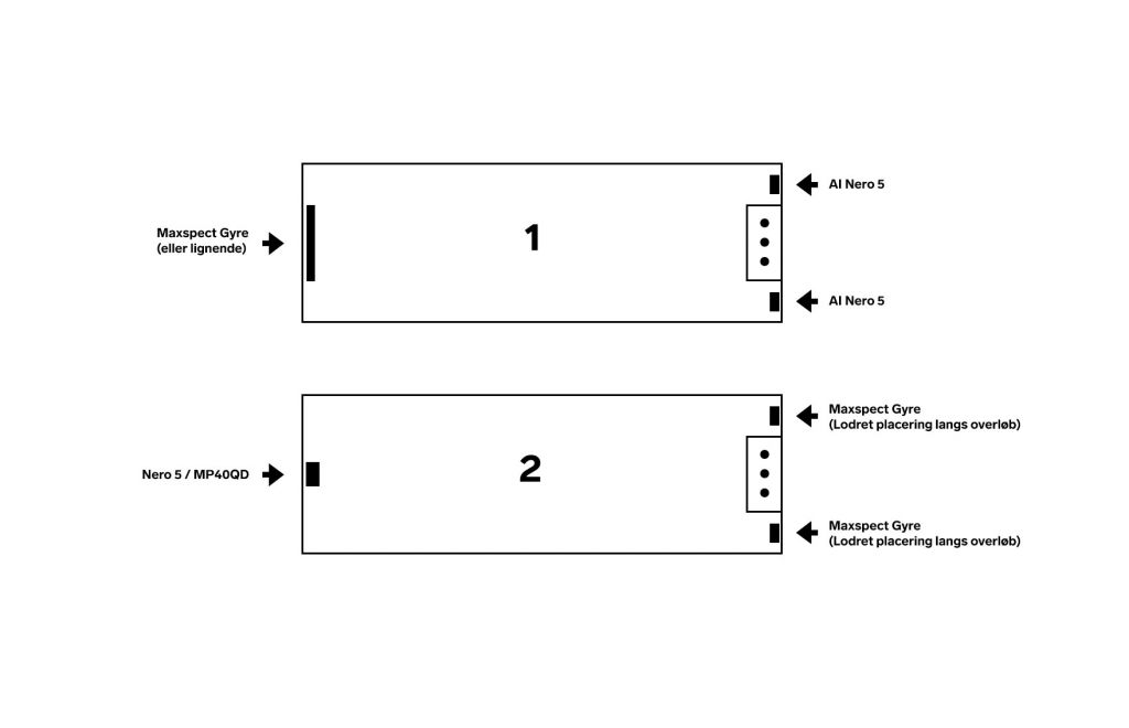 Nero’en har et rimelig bredt flow, så derfor tror jeg det er nok med en på hver side halvvejs nede af glasset. Og så evt. gyre i den anden ande. Det kunne også sagtens blive en Nero/MP40 i den anden ende. Men det er ikke muligt med mp pumperne i enden med overløb, da den står op af væggen som en rumdeler.
