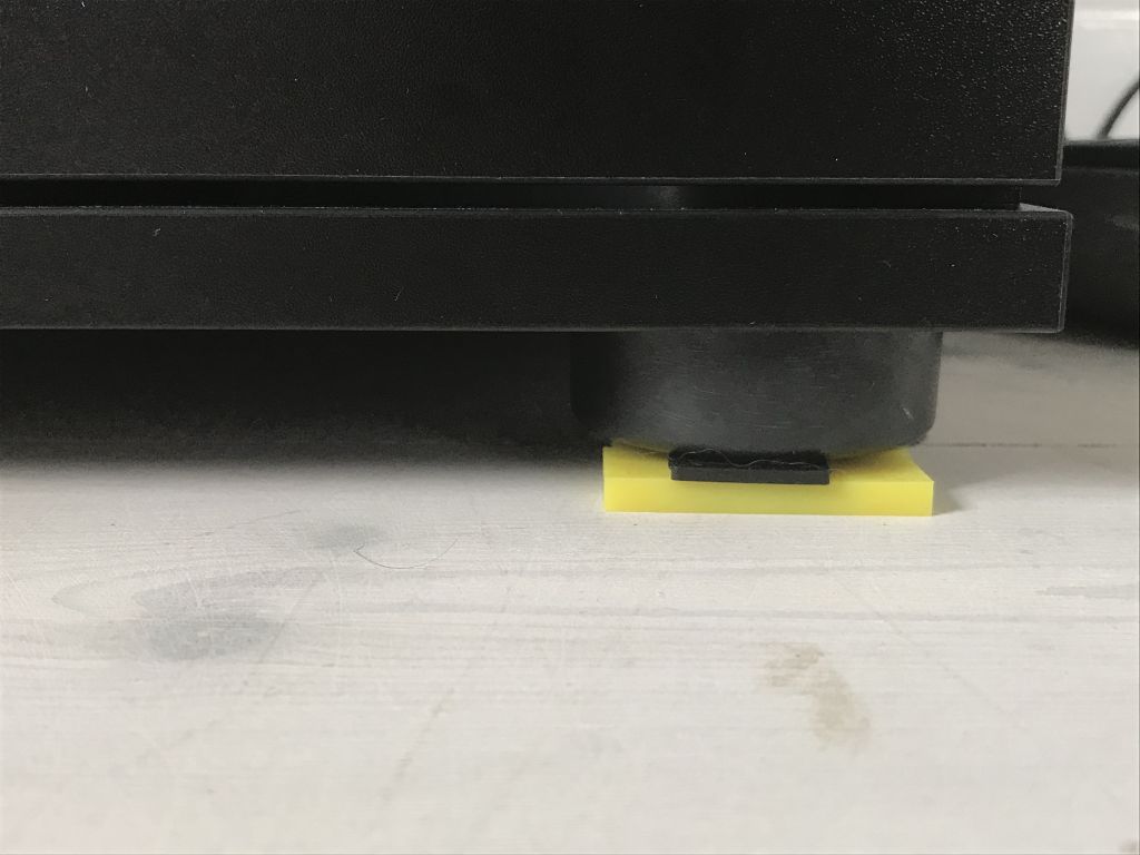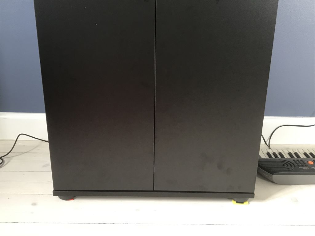 2) en sort plade under alle 4 fødder på skabet. Knudsen afstandsstykker under pladen,