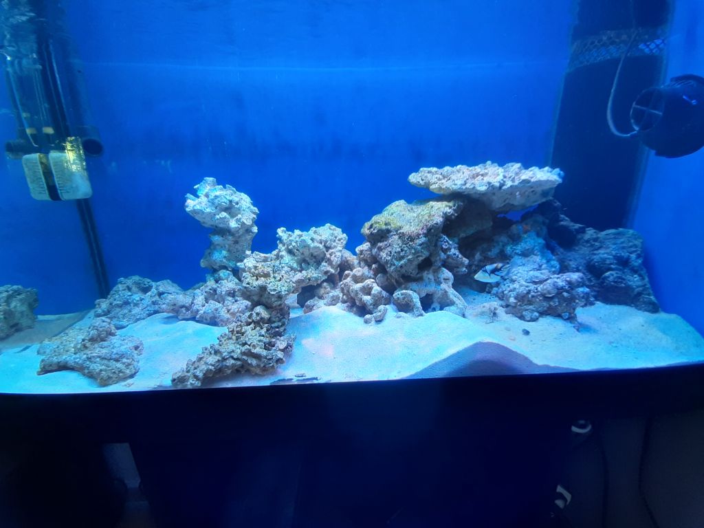 På plads med alt, saltvand blev brygget, og 15. november blev sten (indeholdende 1 stk Picasso) og vand blev flyttet fra 80'eren, suppleret op med friskbrygget vand og til sidst en pose Fiji Pink live sand.