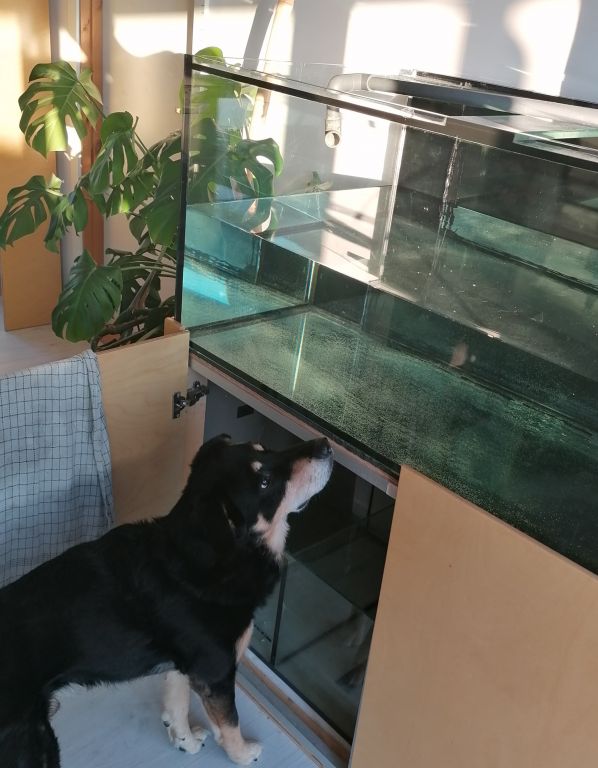 Det med glaspladerne limet på bagvæggen som hylde er jo genialt. Ved at skære sten til med vinkelsliber kan man gøre stenen helt flad på undersiden, minus frontkanten, så den går ud over- og ned foran hyldens kant. Jeg er bange for at jeg bliver nødt til at gøre det samme i mit lille klovneakvarie nu.