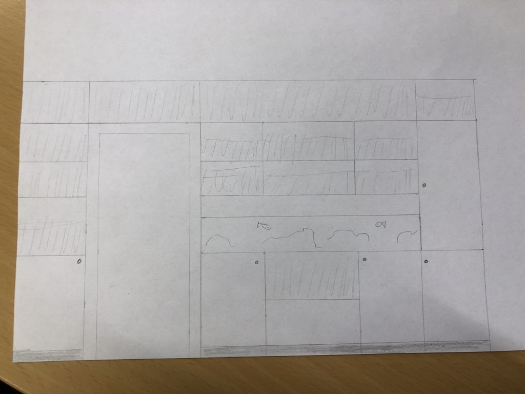 Jeg har nu tegnet min reol til akvariet. Der går lidt tid inden den kan bygges, men jeg har taget højde for strøm og plads. Akvariet kan blive op til to meter langt, afhængig af om jeg ønsker låge til højre eller ej. Jeg ender nok med at vælge de to meter akvarie, fremfor lågen. Der er stor opbakning fra min kæreste, så det er jo om at gribe muligheden.