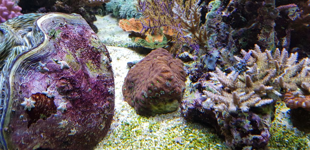 Cyano sætter sig hvor den kan finde en ledig flade. Her på siden af min Tridacna deresa. Det børstes nemt af.
